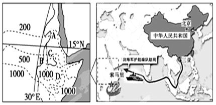 4、单选题 索马里海盗成为全球关注的热点之一,2013年12月26日13时45分,中国海军舰艇编队从三亚起航,经南海,过马六甲海峡,穿越印度洋,预计用10天左右时间抵达亚丁湾、索马里海域执行护航任务。读图,完成问题。