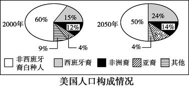 3、单选题 早在2006年,美国人口总数已突破三亿大关。据美国人口构成情况及预测图,回答问题。