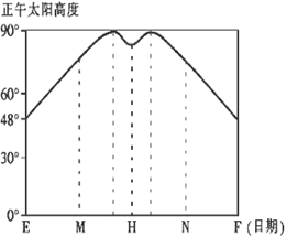 3、单选题 下图为某地一年中正午太阳高度变化示意图,图中M、N分别为EH、HF的中点,H日该地正午太阳位于正南方。读图完成下列问题。