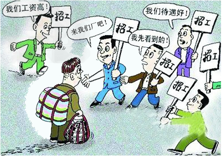 3、单选题 近年来引起人们关注的“用工荒”现象,预计在2012年仍将表现得十分突出,我国中西部地区与东部地区已展开争抢民工的激烈竞争。阅读漫画,回答1-2题。