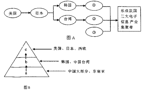 1.图A中,我国承接全球IT产业转移的路径①是指2.图B为IT全球化竞争的金字塔模型,C是指3.下列关于我国IT产业发展趋势的叙述,不正确的是