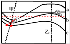 小题1:a、b、c所表示的数值由南向北逐渐减小(a<b<c)即(如下图),可知甲虚线经过的地区为低压槽,乙虚线经过的地区为高压脊,C对。①处吹东北风,A错;②处等压线比①稀疏,风速比①处小,B错;高压脊附近下沉气流,天气晴朗,D错。