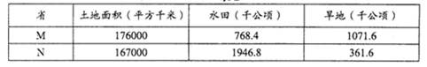 材料二:图中M、N两省耕地结构统计表