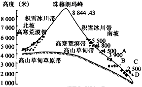 5、综合题 读喜马拉雅山南坡和北坡存在的不同自然带分布示意图,回答下列问题。