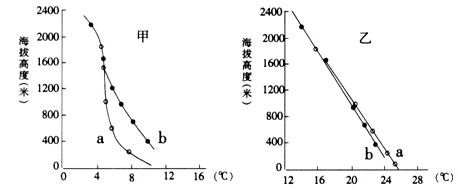 5、单选题 甲、乙两图为武夷山不同海拔高度的12月、6月的月平均气温变化曲线图,其中a、b分别代表方向不同的山坡面。读图回答1—2题。