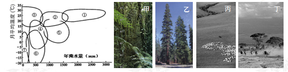 4、单选题 下图左中①~⑦为七种不同的气候类型,下图右中甲~丁表示四种不同的植被景观。回答各题。