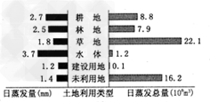 2、单选题 下图为中国某河干流区不同土地利用类型的日蒸发量和日蒸发总量(各类用地面积与其日蒸发量的乘积)。读图完成1-2 题。