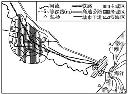 小题2:图中滨海区位于沿海地区,与主城区有多条交通线路联系,交通便利,滨海区的建设可以缓解老城区用地紧张状况,分散老城区城市职能,可以缓解城市化过程中带来的一些环境问题。