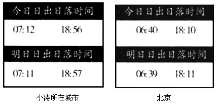 2、单选题 小涛同学计划到北京旅游,他从网上收集到当地和北京的日出、日落时间(均为北京时间)。下图中两日应在几月,小涛所在城市位于北京的什么方向