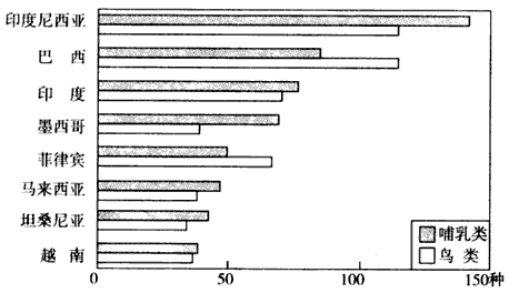 2、综合题 下图是2000年世界濒危物种数量位居前列的部分国家的濒危哺乳动物、鸟类种数统计图。读图完成下列问题。
