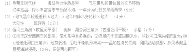 (1)从图中经纬度和河流形状可知a地是南亚地区的恒河,b低东南亚的湄公河。两地的气候同属于热带季风气候。热带季风气候是由海陆热力性质差异和风带、气压带的季节移动形成的。热带季风气候是在热带,所以气候特点是全年高温,降水分配不均,集中在夏季,分为旱季和雨季。