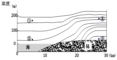 1、单选题 下图为某滨海地区某日某时等压面垂直剖面图(相邻两个等压面气压差相等)。读图,回答以下问题。