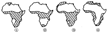 2、依据上图,若按年降水量>500mm为地表水资源较丰富区,年降水量<500mm为地表水资源缺乏区,绘制非洲地表水资源分布示意图。下面四幅图中绘制较为准确的是