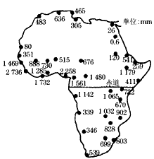 2、单选题 读非洲大陆年降水量点位分布图,完成1—2题。