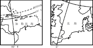 4、综合题  左图为加勒比海位置示意图,右图为北海位置示意图,读图回答问题。