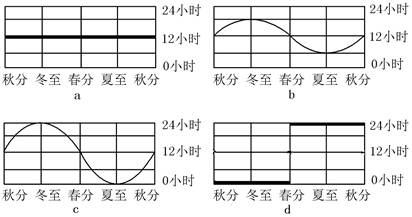 【小题1】据图可知,a地全年昼夜等长,所以为赤道;b地冬至日昼最长,夏至日昼最短,所以是南半球中纬度地区;c地冬至日昼最长且为极昼而且仅一天极昼,夏至日昼最短且为极夜,所以是南极圈;d从秋分到春分为极夜,从春分到秋分为极昼,所以是北极点。因此,本题选D。