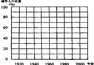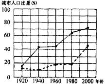 (2)根据表中数据在下面的坐标系中画出1920年至2000年发达国家(用实线表示)和发展中国家(用虚线表示)城市人口比重变化的折线图。(4分)