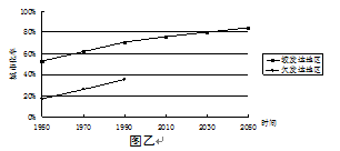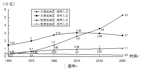 3、综合题 (20分)图甲是1950~2050年世界上较发达地区和欠发达地区城市人口与农村人口变化趋势示意图。据图回答问题。
