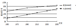(3)欠发达地区城市化水平低,发展速度较快,城市化水平逐步提高,与发达国家的城市化水平的差距不断缩小。所以画图时要画上升的斜线,且与较发达地区的差距要缩小。
