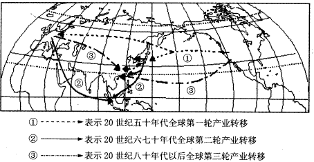 4、单选题 图10是二十世纪50年代以来某产业转移示意图,读图完成19-21题。