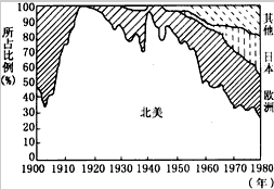 4、综合题 读“1900~1980年世界汽车生产份额的地域变动图”,回答下列问题。