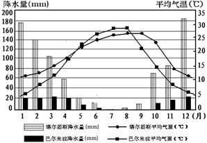 材料二:塔尔图斯和巴尔米拉气候比较图(下右图)。