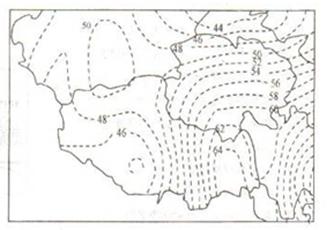 3、单选题 云量是云遮蔽天空的百分比,读“青藏高原及周边地区多年平均总云量空间分布(%)图”,回答各题。