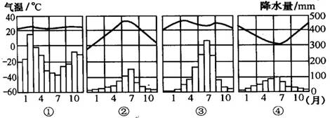 1.根据图示各气候类型的气温、降水分布特征判断,①地终年高温多雨,判断为热带雨林气候;②地最低月温在0°C以下,降水量集中于夏季,故判断为温带季风气候;③地终年高温,降水量集中于夏季,判断为热带草原气候;④地雨热不同期,为地中海气候。