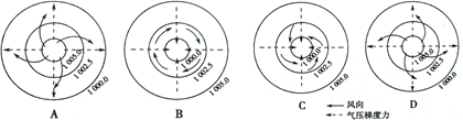 本题解析:本题考查天气系统。气旋中心气压为低压,故水平气流运动方向为四周向中心的辐合;且在北半球,风向应向右偏,故选C项。