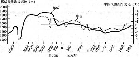 2、单选题 下图是10000年来挪威雪线高度和近5000年来中国气温距平变化图,据此回答下列问题。