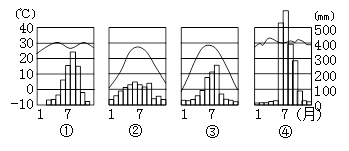 本题解析: 完全属于海陆热力性质差异影响下形成的气候类型主要是亚热带季风气候和温带季风气候;根据气温判断热量带,结合降水得出气候类型;①图全年高温,且干湿季分明,为热带草原气候;主要是收到信风带和赤道低气压带交替控制形成,②图最低气温大于0℃,且降水丰富,雨热同期,为亚热带季风气候;③图最低气温小于0℃,雨热同期,为温带季风气候;④图全年高温,降水丰富,夏季降水多,为热带季风气候,主要是海陆热力性质差异和气压带与风带的季节移动共同作用所形成的;而完全受海陆热力性质差异影响下形成的是②③,选择B项。