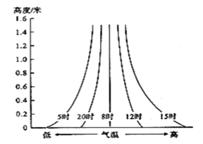 小题1:对流层气温垂直分布规律是随着高度的升高而降低,下高上低的大气结构有利于对流的对流,大气较稳定。读图可知,5时、20时出现逆温,大气稳定,12时、15时逆温消失。正确答案选A。大气热量主要来自地面辐射,逆温从上而下逐渐消失也说明这一问题。气温日较差的大小可以通过观察各气温曲线之间的气温差判断,下部明显大于上部。正确答案选A。