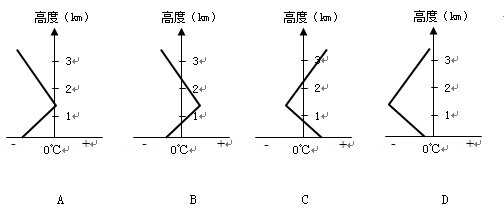 5、单选题 冻雨是上层的过冷水滴、冰晶、雪花进入中间暖层化为水滴,再降落到近地面并接触到0℃或以下物体表面立即冻结的特殊天气现象。下列气温的垂直分布示意图中,最有可能形成冻雨的是