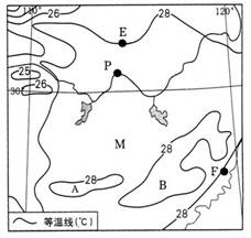 (3) E地等温线向低纬(南)突出(1分),主要受地形影响(1分)F地等温线大致与海岸线平行(1分),主要受海洋影响(1分)
