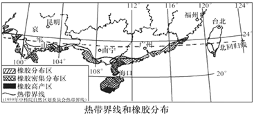 (1)阅读材料可知,天然橡胶喜高温、高湿,而北回归线以南地区,纬度低,热量条件好,且雨季长,降水多,远离冬季风源地,受寒潮影响小,适合种植天然橡胶。