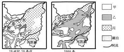小题1:图示三江平原地区在20世纪50年代以丙类土地为主,判断丙类土地资源利用类型为湿地;而2000年丙类土地大面积较少,而乙类土地利用类型大面积扩大,判断乙类土地利用类型为耕地,反映该地区50年代以后的长期开垦湿地;而甲类土地利用类型主要分布于山地,判断为林地。
