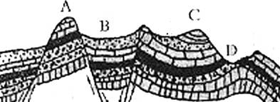 小题1:图中A、B、C、D四地,属于背斜构造的是