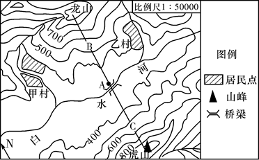 (1)从图中指向标来看,白水河是东西走向,地势是东高西低,所以河流的流向为自东向西;甲村海拔400米以下,龙山的海拔是900米以上,高差为500米—700米,根据海拔每升高100米气温下降0.6摄氏度,所以甲村与龙山之间的温差范围是3℃ 到4.2℃之间。