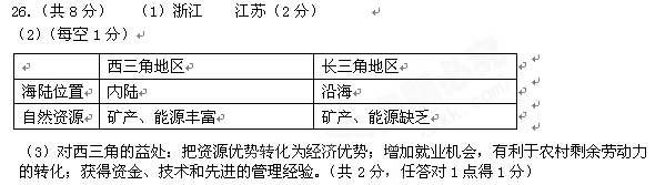 (2)列表比较“西三角地区” 与“长三角地区”的差异。(4分)