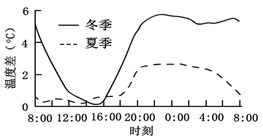 5、单选题 热岛温度为城区与郊区气温之差,其值高低反映了热岛强度的大小。从下图中可得到的正确信息是,某市热岛强度