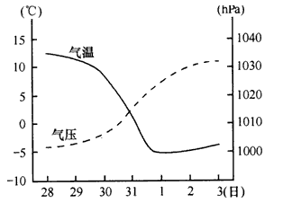 (1)读“上海市气温、气压变化示意图”,分析这次寒潮过境前后天气变化情况: