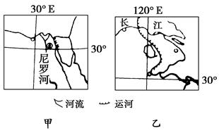 (1)甲地区属于热带沙漠气候,终年炎热干燥;乙地区属于亚热带季风气候,夏季高温多雨,冬季温和少雨。甲地区常年受副热带高气压控制,降水稀少;乙地区受海陆热力性质差异的影响,季风气候显著。