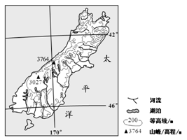2、单选题 下图为新西兰南岛示意图,高山顶部终年白雪,山间多冰川,西南端有典型的峡湾海岸。2014年11月位于该岛的中国伊利大洋洲乳业生产基地正式投产。读图,完成下列各题。