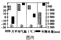 3、单选题 读某民居区在不同季节的景观图(图甲、图乙)和四地月平均气温和年降水量资料统计图(图丙),完成1—3题。
