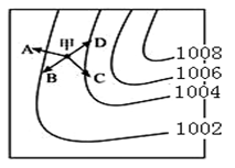 1、单选题 右图为某地等压线分布图,图中箭头代表甲地空气的受力情况和风向,据图回答以下问题。