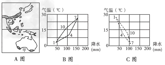 (1)B、C两图中与A图中甲地(阴影部分)气候类型相匹配的是______图,这种气候的成因是______________________________。