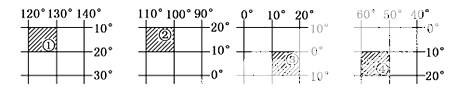 小题2:在四幅图中斜线所表示的经纬线方格内,面积最大的是