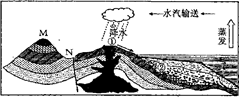 本题解析:本题考查地质构造和水循环。(1)图示M处为向斜,“背斜储油,向斜储水”。向斜成山主要从外力作用的角度分析。(2)图示①处为火山喷发,故形成的是岩浆岩;②处经外力作用而形成沉积岩。(3)N处为断层,地质运动较活跃,不适宜建设大型工程建设。(4)我国东南沿海为亚热带季风气候,气候特点应从气温和降水等方面分析。