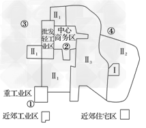 1、单选题 下图为某城市功能区规划图,图中都为合理布局。据此完成: