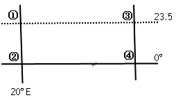 1、单选题 图中,②点为12:00,太阳高度为90°;④点为昏线与赤道的交点。读图回答问题。